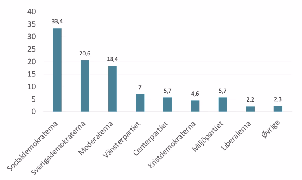 Lige nu er det Socialdemokraterna, som står til at blive det største parti, hvis der var valg. Valget til Riksdagen er den 13. september i år.